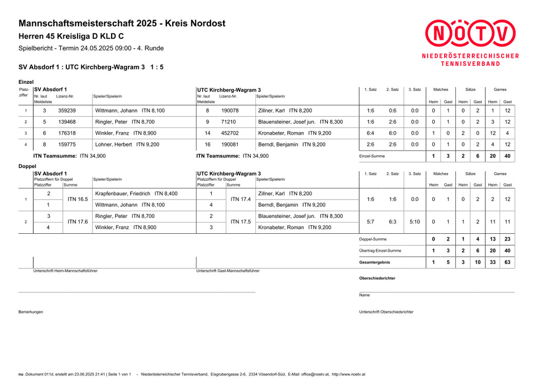 SPIELBERICHT RUNDE #4 - SVA vs. UTC KIRCHBERG 1:5
